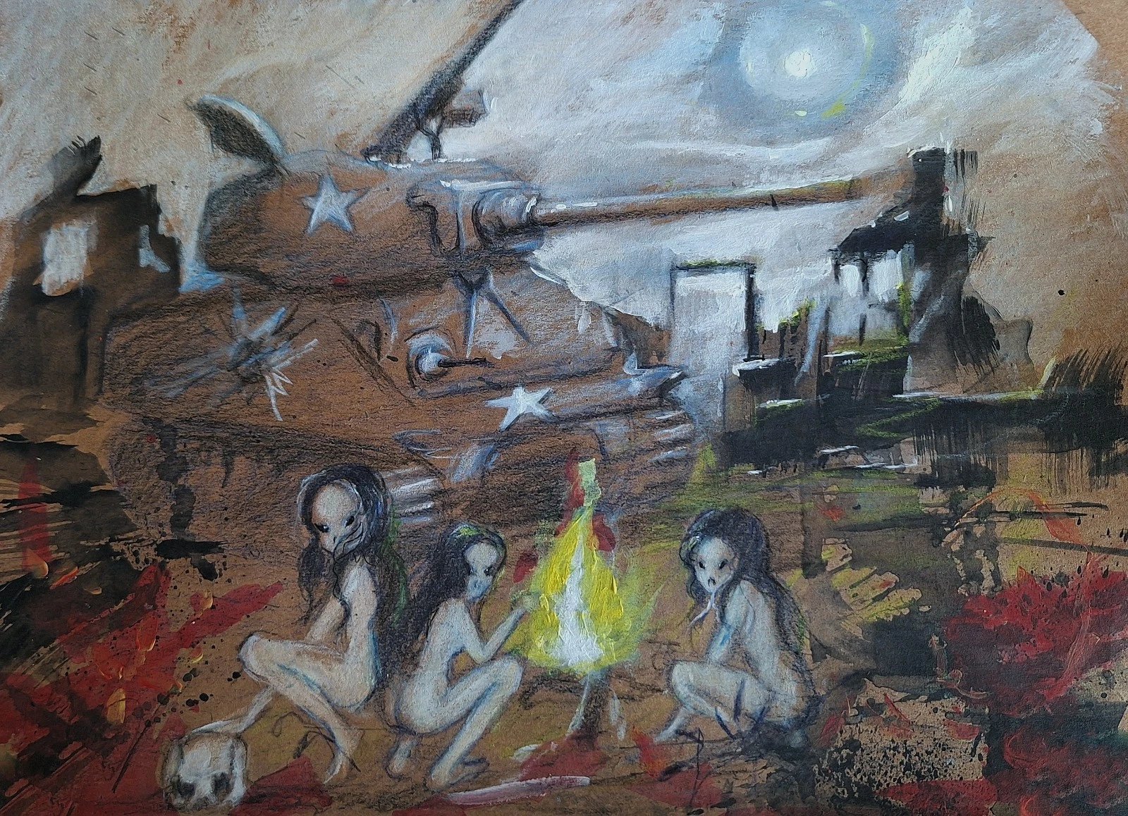 She Wolves WW2 Tank Landscape Nudes. A4 card, pencil and acrylic paint. Signed and dated.UK USA Worldwide shipping.