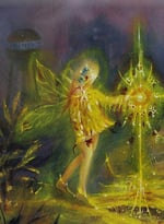 My painting portrays a whimsical yet eerie fantasy scene set in a dimly lit landscape under a purple-hued sky. A glowing yellow fairy with delicate wings and a flowing dress hovers on the left, extending her arm to cast a vibrant, sparkling beam of magical energy from her hand. The beam strikes the ground near a diminutive, cartoonish football player on the right, who wears a crimson Alabama Crimson Tide uniform (including a helmet with an "A" logo, jersey number 21, and pants labeled "Crimson Tide") while clutching a football in a defensive pose. In the background, a water tower labeled "Vinemont" looms, alongside a shadowy, ominous figure with glowing eyes peering from the mist-shrouded hills. The overall style is vibrant and surreal, blending elements of magic, sports, and subtle menace.